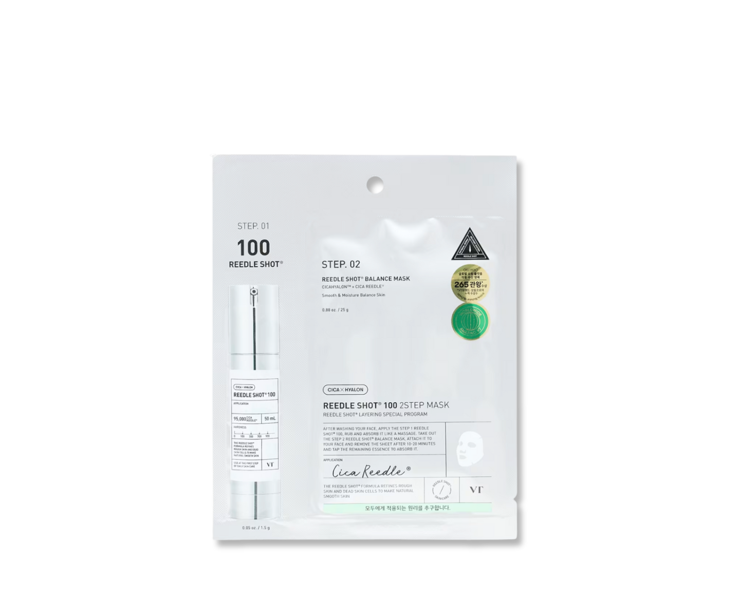 Un masque 2-en-1 : une ampoule microneedling au Cica Reedle™ pour stimuler la régénération, suivie d’un masque crème riche en céramides, collagène et acide hyaluronique pour hydrater, apaiser et renforcer la barrière cutanée.